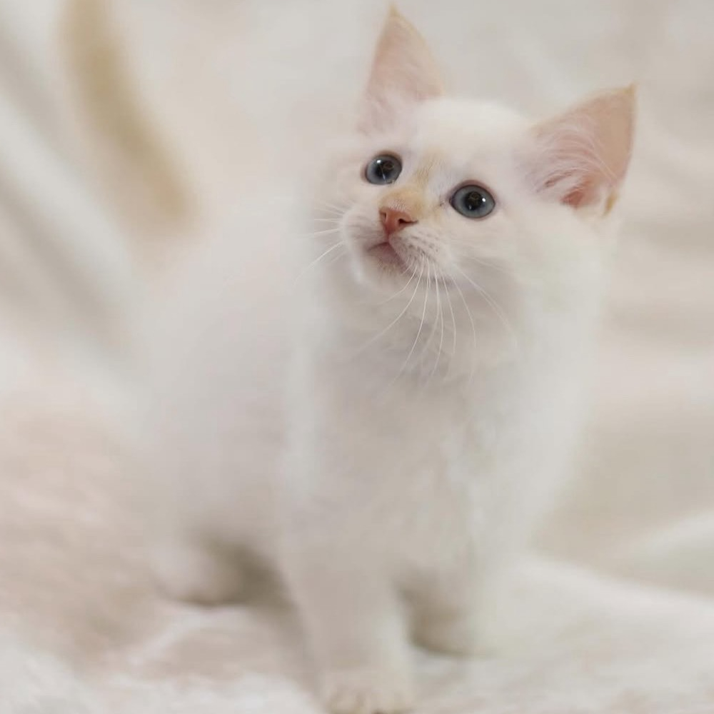 ラグドール:外見は、シルクのように柔らかな長毛と吸い込まれるような青い瞳が最大の特徴です。大人になると猫の中でも大型で、がっしりとした重量感のある体つきをしています抱き上げるとぬいぐるみのように脱力するしなやかさを持っています。顔や耳、尻尾などに色がのるポイントカラーの模様が、その気品ある雰囲気を引き立てています。